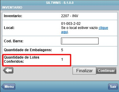 A partir da versão 8.1.0.0, será visualizado o campo Quantidade de Lotes Conferidos se no Inventário estiver configurado para Conferir Lote Indústria, no Produto x Depositante ativado o parâmetro Conferir Lote Indústria, e Não Fracionar Lote ou Utilizar Backlist (Por Volume, Quantidade ou Volume / Quantidade).
