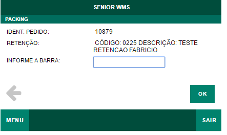 No campo “Informe a Barra”, o sistema solicitará ao conferente que informe o código de barras da embalagem do produto, clicando no botão OK para continuar.