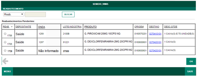 No Coletor de Dados / Remanejamento Origem o sistema solicitará o código do remanejamento previamente cadastrado, direcionando o funcionário/separador para o local informado na tela do coletor de dados, exibirá a lista de lotes a partir do botão “Listar Lotes” e após informar o sistema com o código de barras do produto, o separador poderá clicar no botão “Falta” para informar a quantidade que existe no endereço, ou se clicar no “Continuar”, o sistema entenderá que o local de origem contém a quantidade informada na tela do Coletor de Dados.