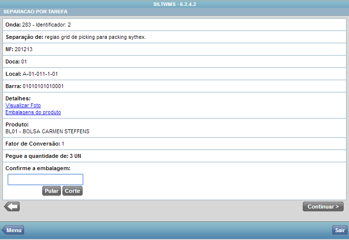 Serão apresentados na tela os dados da separação do produto, código de barras da embalagem, descrição do produto, fator de conversão, quantidade necessária para retirada do local, será permitido usar os botões “Visualizar Foto”: onde exibirá a foto do produto, que foi vinculada no Cadastro do Produto e “Embalagens do Produto”: listará todas as embalagens do produto. Clicar nos botões “Pular”: que informará ao sistema que o local será visitado em outro momento ou “Corte”: demonstra para o sistema que no local não existe a quantidade necessária informada, sendo necessário a ativação do parâmetro “Utiliza Corte Físico” na Configuração do Armazém. Obs: Mas para ativar ou não este parâmetro irá depender do gerenciamento do armazém. A decisão do Corte Físico será concluído na tela do Silt Enterprise / Monitoramento / Corte Físico.