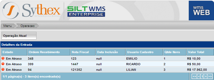 Exibirá as Ordens de Recebimento, Notas Fiscais, Usuário Responsável pela Inclusão e Valor Total.