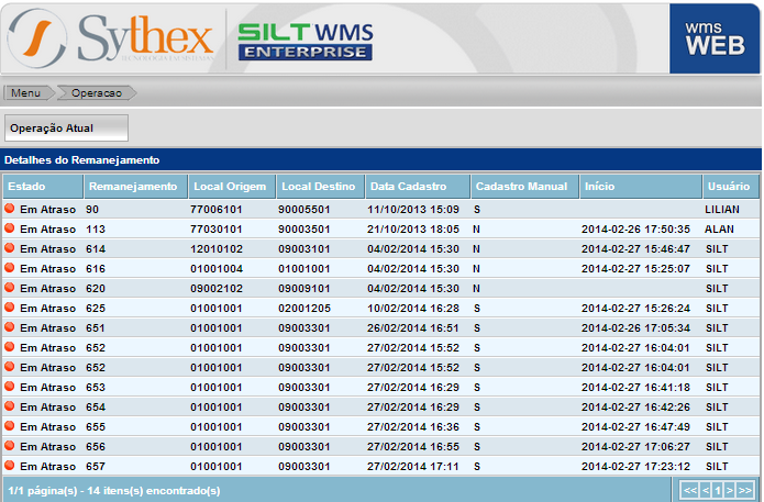 Visualizará os Remanejamentos, Local Origem e Destino, com a Data de Cadastro, se o Remanejamento foi cadastrado Manualmente ou Não(ao formar Onda ou Romaneio) e o usuário responsável pela criação do remanejamento.