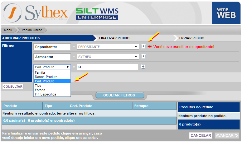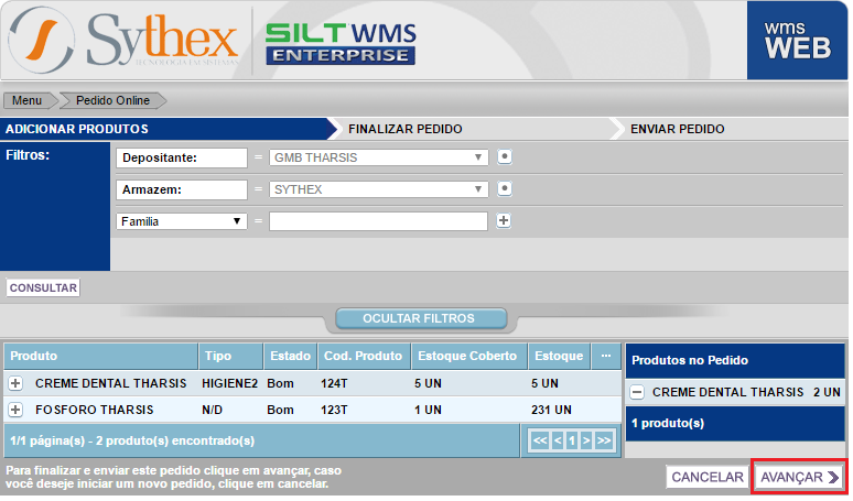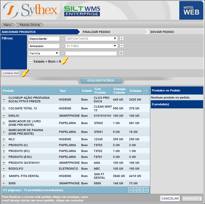 , serão listados os produtos que estão no estoque referente ao Depositante, o Armazém e aos demais filtros selecionados.