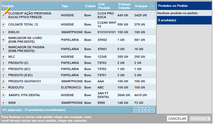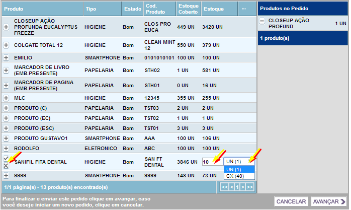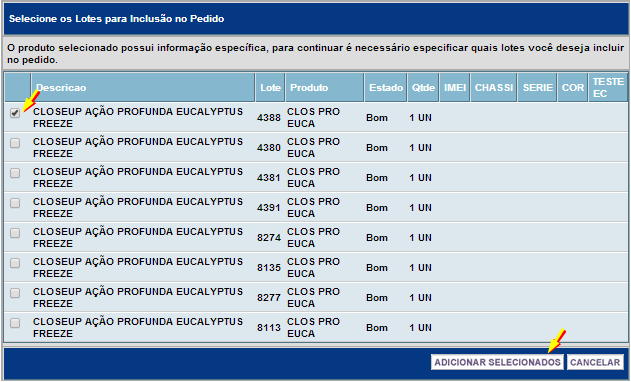 , primeiro campo da linha do produto. Para concluir a seleção clique no botão