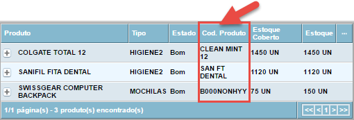Desde a versão 8.5.0.0, foram realizados ajustes para exibir o Código Interno do Produto x Depositante e, caso não haja, exibirá o Código Interno do Cadastro do Produto na coluna COD. PRODUTO.