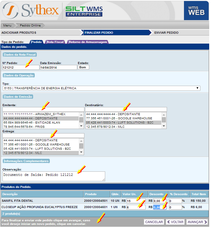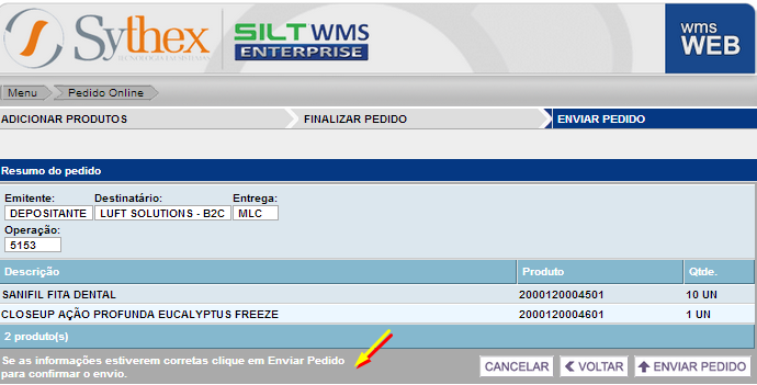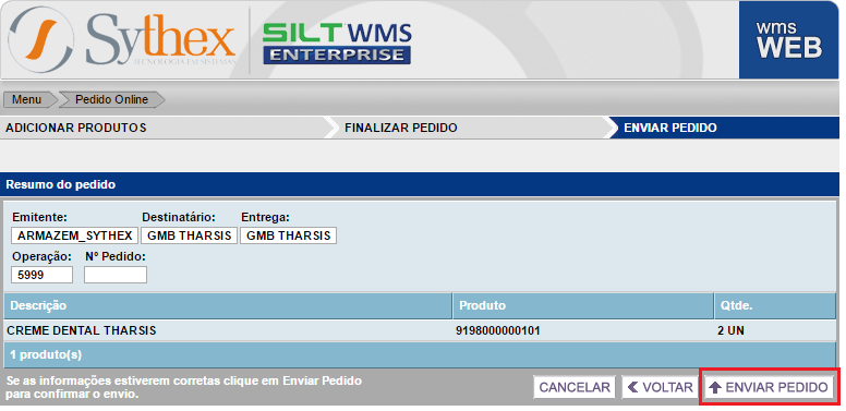 Caso seja necessário continuar com a criação do Documento de Saída, faz-se necessário confirmar, clicando no botão “Enviar Pedido”.