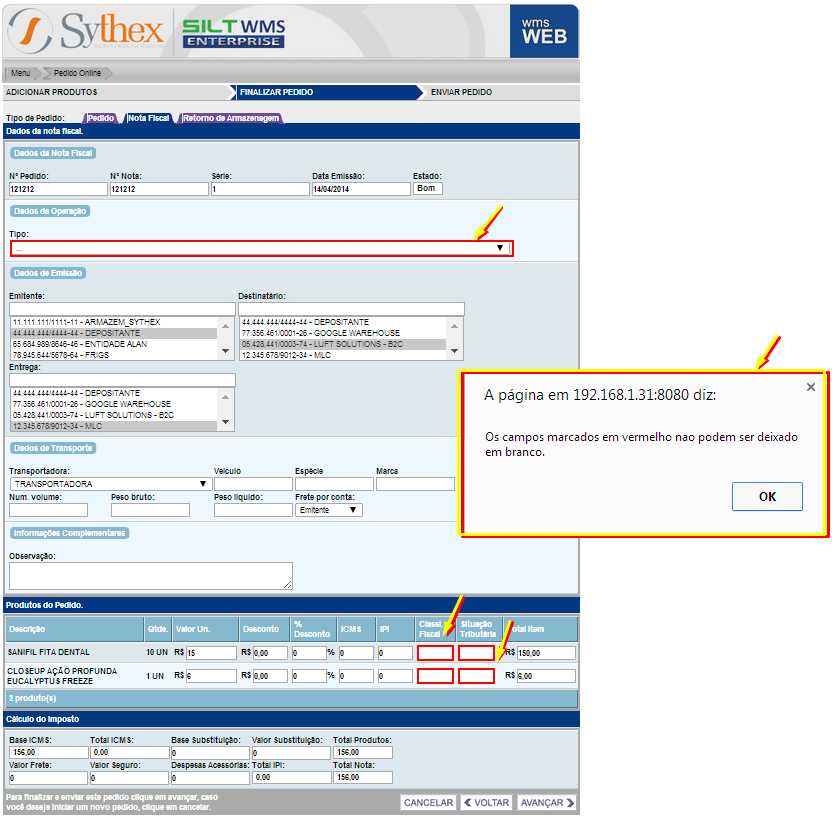 , e se os campos obrigatórios não estiverem preenchidos, o sistema grifará os campos, solicitando que sejam preenchidos antes de encaminhar para a próxima tela.