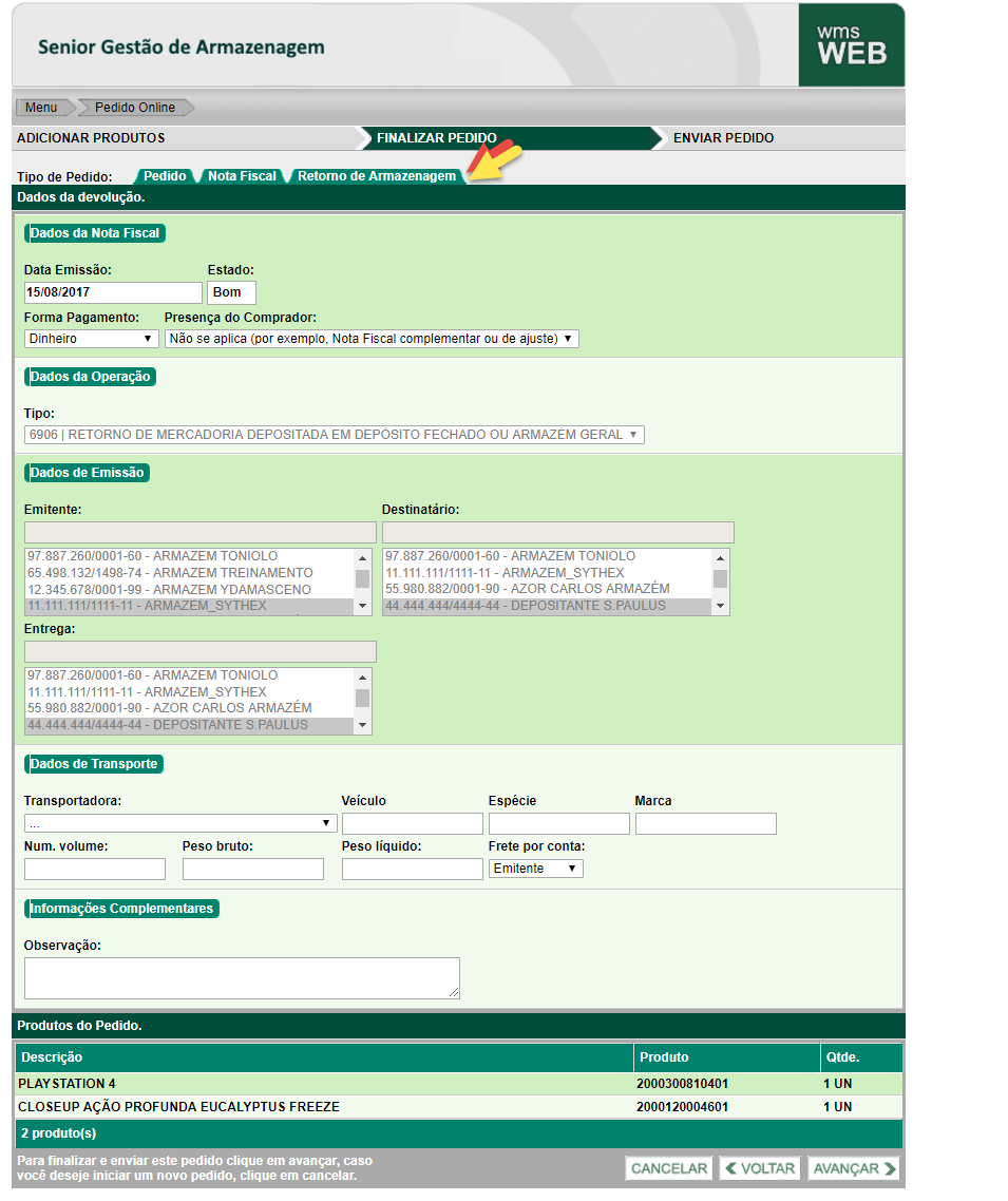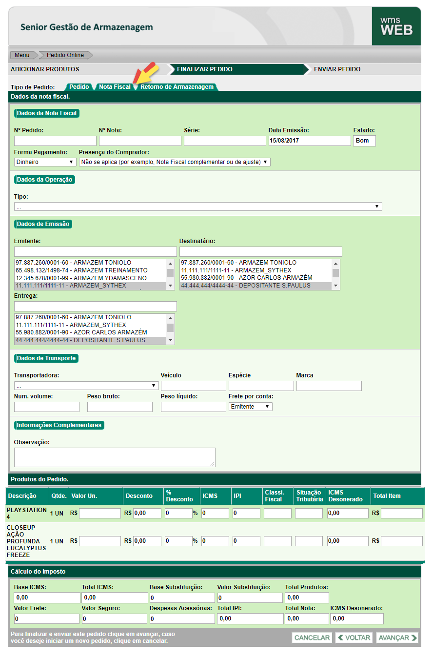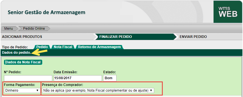 A partir da versão 7.8.0.0, o campo “Tipo” foi removido, onde o sistema buscará o CFOP Interno (mesmo estado) ou Interestadual (diferente estado), de acordo com o Estado do Endereço da Entidade do Armazém e do Depositante. - A partir da versão 8.9.4.0, foram adicionados os campos Forma de Pagamento e Presença do Comprado, que auxiliarão no preenchimento da NF-e 4.0.