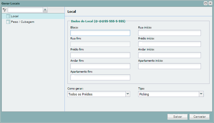 - Tipo: escolher entre os locais de Picking, Pulmão ou Colmeia.