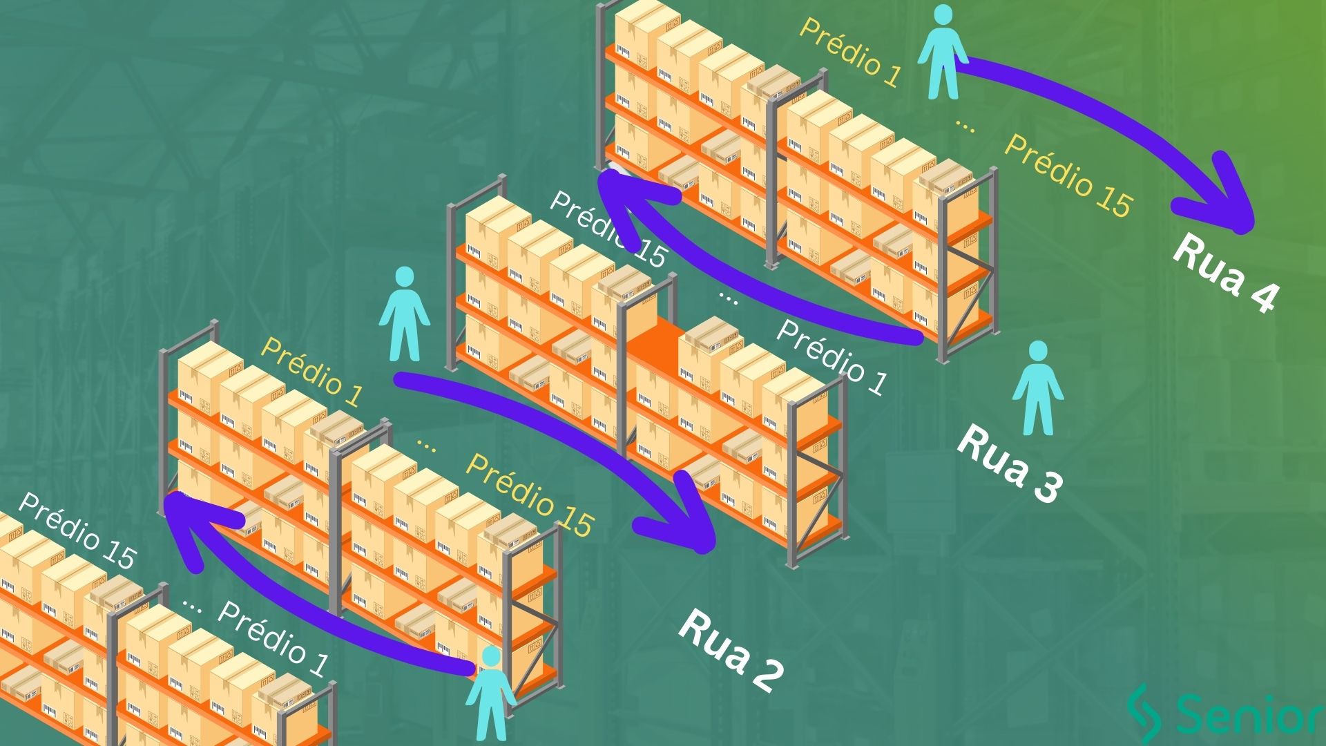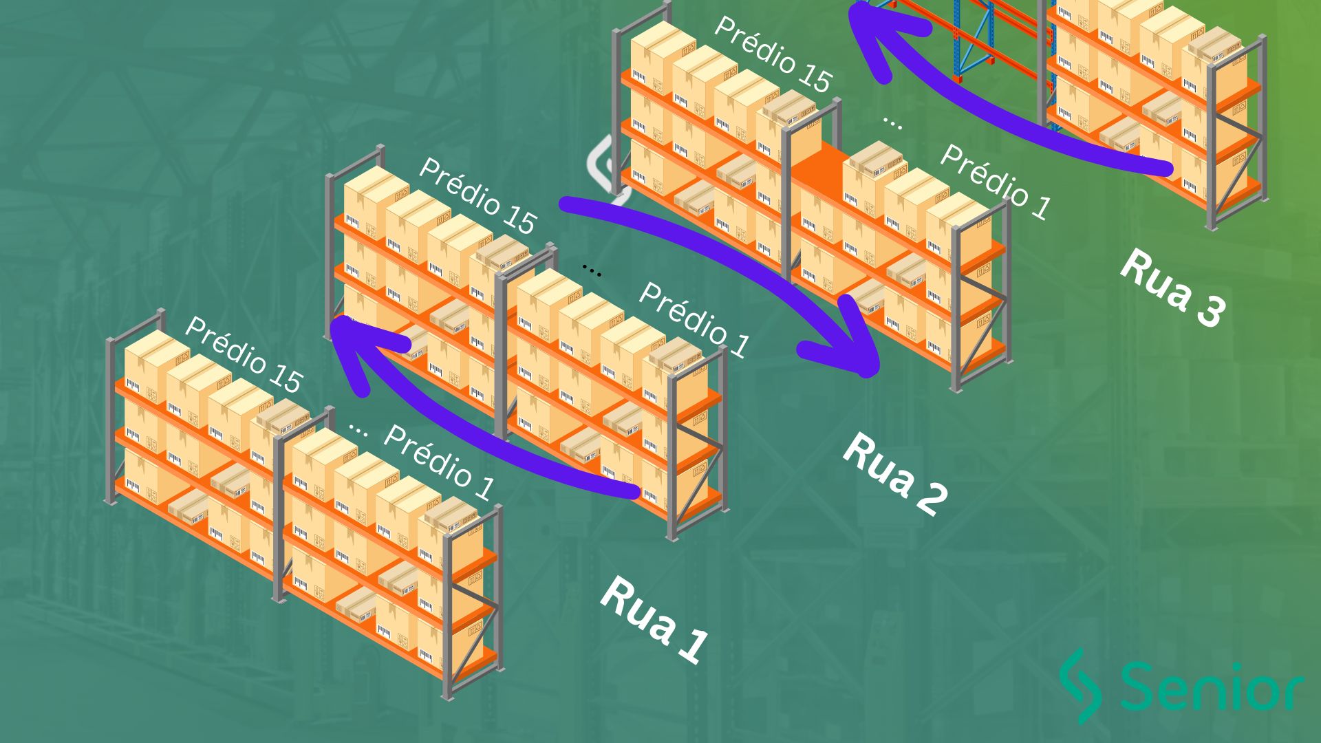 A lógica de organização do WMS Senior é projetada para otimizar a eficiência na separação de produtos, reduzindo o número de passos necessários pelo separador. O layout de armazenagem segue uma estrutura padronizada, em que os endereços dos prédios e ruas são organizados do menor para o maior. As etiquetas são aplicadas conforme essa ordem, facilitando o trabalho do separador ao garantir que ele percorra o menor trajeto possível.