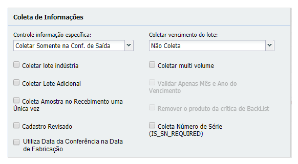 - Auditoria de Entrada: indica se após a geração dos lotes de recebimento, os lotes do produto em questão passam por auditoria de recebimento no Coletor de Dados > Auditoria de Entrada.