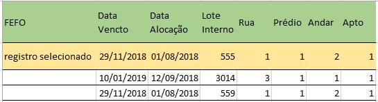 - FEFO e Sequência de Locais: o sistema busca os lotes ordenados primeiramente primeiro a expirar > sequência de locais (rua, prédio, andar, apto) > data de alocação > identificador interno do lote. (Referente 8.12.7.188/ WMSCT2-1024)