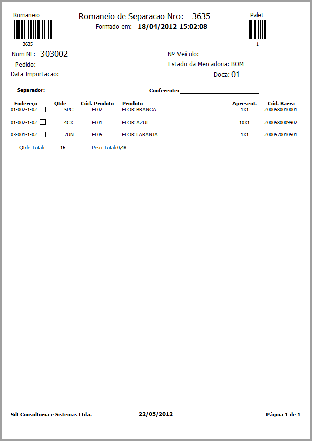 - Modelo Relatório Separação: relatório que é exibido ao clicar no botão Separação por Cliente, na tela do front-end / Gerenciador de Romaneio (tipo romaneio).