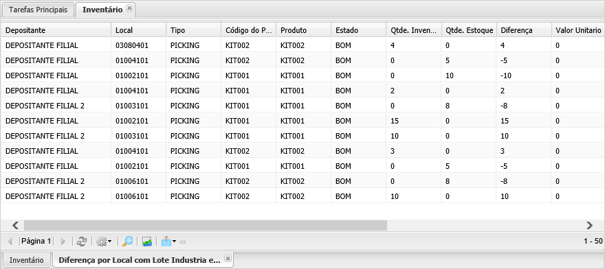 O usuário pode consultar as diferenças entre o estoque anterior ao inventário e o estoque contado no inventário para cada local e produto.