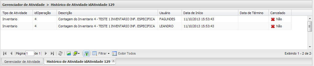 O grid da tela de Gerenciador de Atividade, possui o botão Exibir que mostra os filtros da coluna Situação que exibe os registros: Todas, Pendente, em Execução ou Finalizada, com o agrupamento de Vincular a Atividade com o botão: Usuário e com outro botão Histórico.