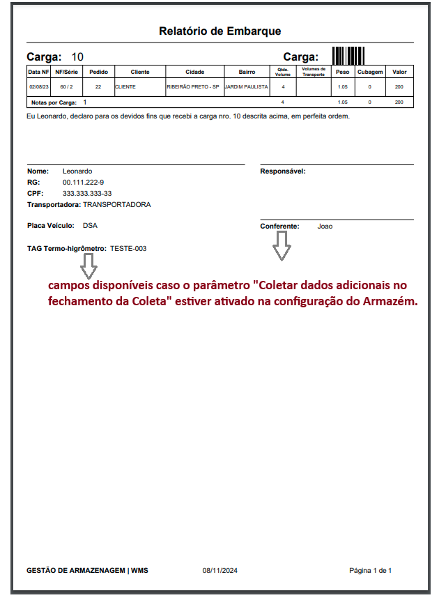 - Quando o parâmetro Coletar dados adicionais no fechamento da Coleta estiver ativado na configuração do Armazém, o relatório exibirá também Conferente Transportadora e Tag Termo-higrômetro. (Referente a versão versão 8.12.7.244 / WMSCT3-3382)