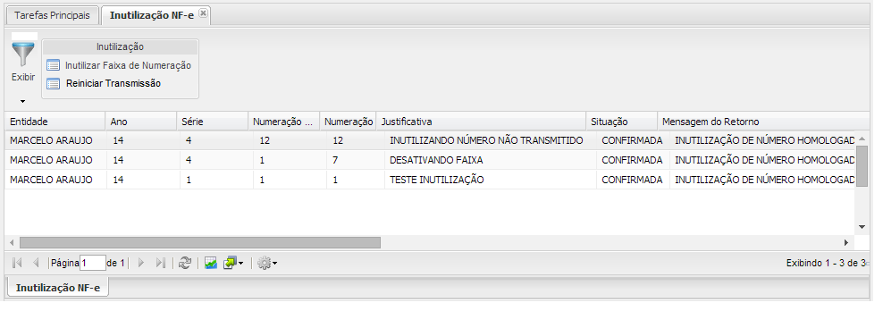 Foi implementado filtro (Aguardando Envio, Confirmado, Erro de Validação e Todos) para facilitar a visualização dos registros de inutilização. Somente as entidades com o flag “Emite Nota Fiscal Eletrônica” ativado que são exibidas na busca.