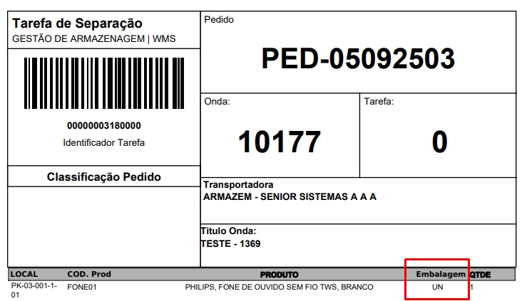 - Caso o Tipo Etiqueta estiver setado para TAREFAS SEPARAÇÃO, é utilizado uma folha A4 para a impressão: