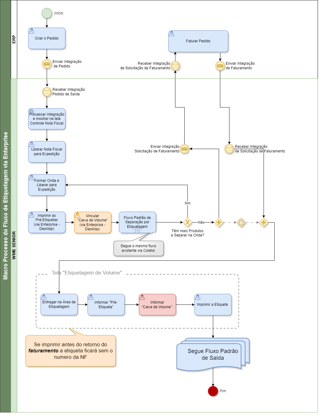 Após a Separação ou Conferência do material, o WMS Senior realiza a comunicação com o ERP através da interface de Retorno de Faturamento, solicitando ao ERP que realize o faturamento e envie as informações de Faturamento para o WMS Senior.