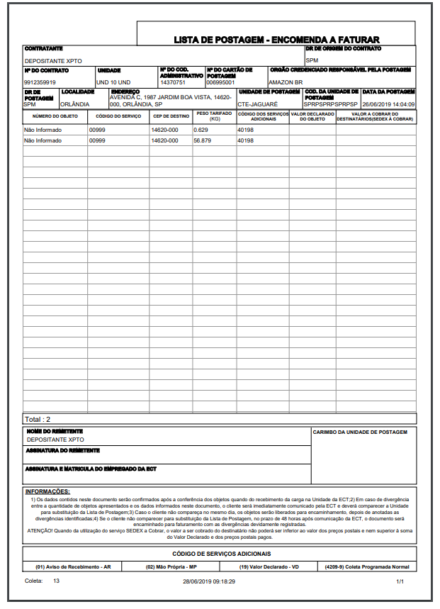 - DR de Postagem: visualiza o relatório Lista de Postagem – Encomenda a Faturar, a partir da tela da Movimentação > Saída > Gerenciador de Coleta > selecionar registro > botão Impressos, pois as informações de transporte dos correios mudam conforme a unidade na qual são entregues os volumes para redespacho.