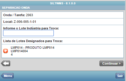 Via Coletor de Dados, o sistema permite que o operador possa informar novos lotes indústrias para troca que estejam em outros endereços diferente do endereço de Separação atual, sendo assim ao informar um lote indústria em local diferente do local em separação, durante a realização da troca o sistema cria automaticamente um remanejamento com o lote indústria desejado com a origem o endereço atual do mesmo e endereço de destino sendo endereço em separação na onda seguindo as mesmas regras de setor do produto, setor do depositante, peso e cubagem para criação sendo o mesmo, ou seja, o endereço de destino deve ser compatível para execução do remanejamento. Caso o lote indústria informado não possa ser remanejado para o local em separação é exibido uma mensagem que o mesmo não pode ser utilizado para a separação.