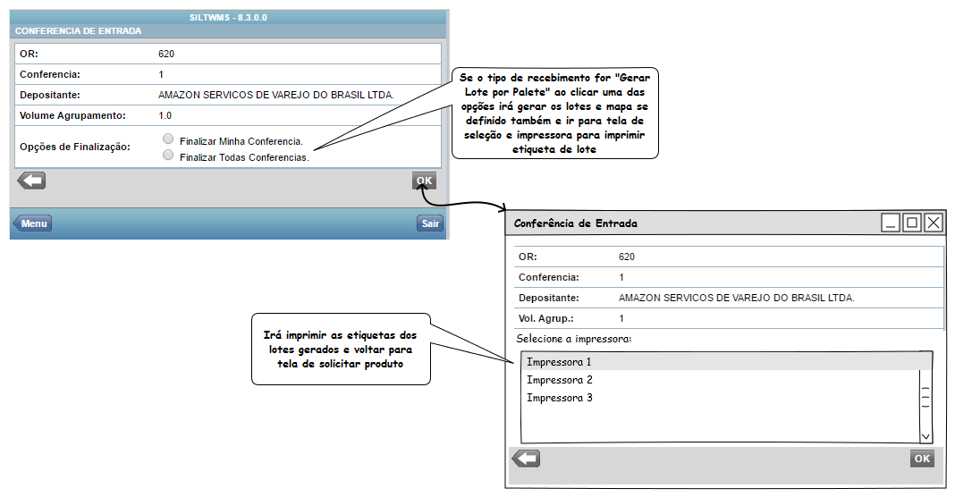 Funcionalidade criada, a medida que os lotes forem gerados, estes podem ser alocados, sem a necessidade de realizar toda conferência de entrada primeiro, isto ocorre se a OR estiver vinculada ao Tipo de Recebimento: Gerar Lote por Conferência. Os lotes são gerados a medida que o conferente finaliza sua conferência no coletor de dados na opção “Finalizar Minha Conferência” e caso o parâmetro “Gerar Alocação por Conferência” situado no Tipo de Recebimento esteja ativado é possível Gerar o Mapa de Alocação indicando o local de armazenagem, possibilitando assim a impressão das etiquetas dos lotes( modelo definido na configuração geral ). O sistema lista as impressoras disponíveis (que foram instaladas e mapeadas no servidor de aplicações), e após a impressão o sistema questiona o usuário se a impressão for bem-sucedida ou não. Em caso negativo é perguntado se deseja reenviar a impressão ou selecionar nova impressora.