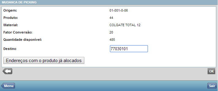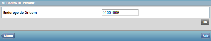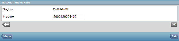 É solicitado para o usuário informar o endereço de picking, depois informar o código de barras da embalagem do produto que está localizado no picking e depois o sistema solicita o endereço destino do picking para a mudança de local.