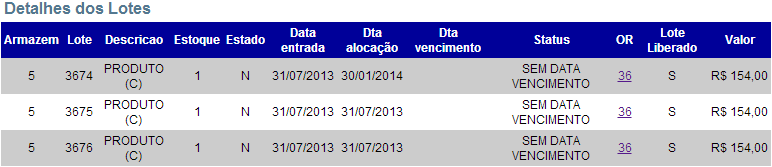 , o sistema lista os Detalhes dos Lotes dos Produtos, conforme exemplo listado abaixo: