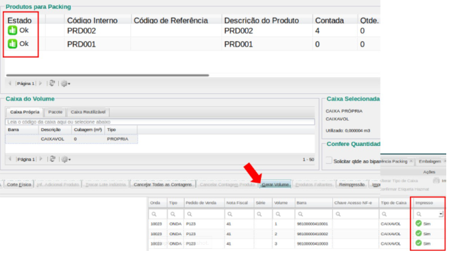 - Termine a conferência desejada para gerar os volume, o usuário escolhe uma caixa de volume, e clica em Gerar Volume;