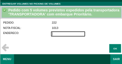 - O sistema apresentará a mensagem que o local está inválido, e solicitará entregar o volume no endereço sugerido pelo sistema.