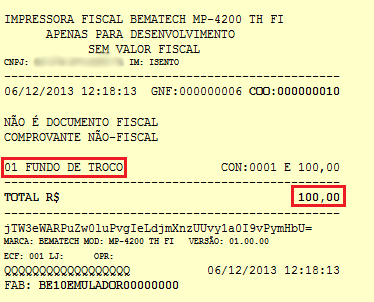 O exemplo simula a abertura de caixa informando um fundo para troco no valor de R$ 100,00.
