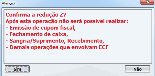Caso a redução Z seja emitida acidentalmente antes do fechamento do dia, não será possível mais operar nesse terminal, pois o ECF ficará indisponível. Ao tentar emitir redução Z com o caixa em aberto, o sistema exibirá uma mensagem de alerta.