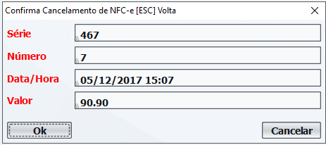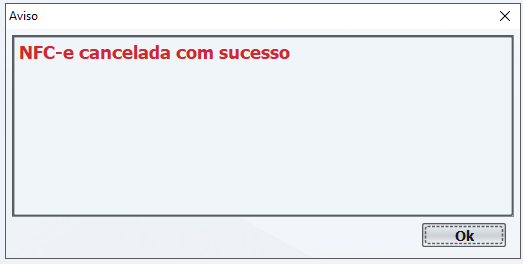 Será apresentada a tela de confirmação do cancelamento com as informações da NFC-e gerada anteriormente: