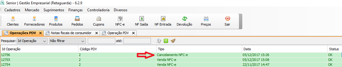 O status de cancelamento também pode ser consultado na tela de Operações PDV do Retaguarda: