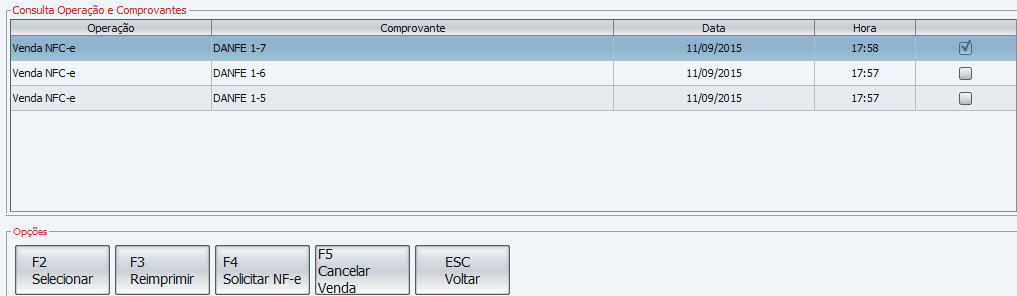 - Logo após, é possível selecionar a operação desejada para efetuar a reimpressão, solicitar NF-e, cancelar venda ou retornar para à tela principal.