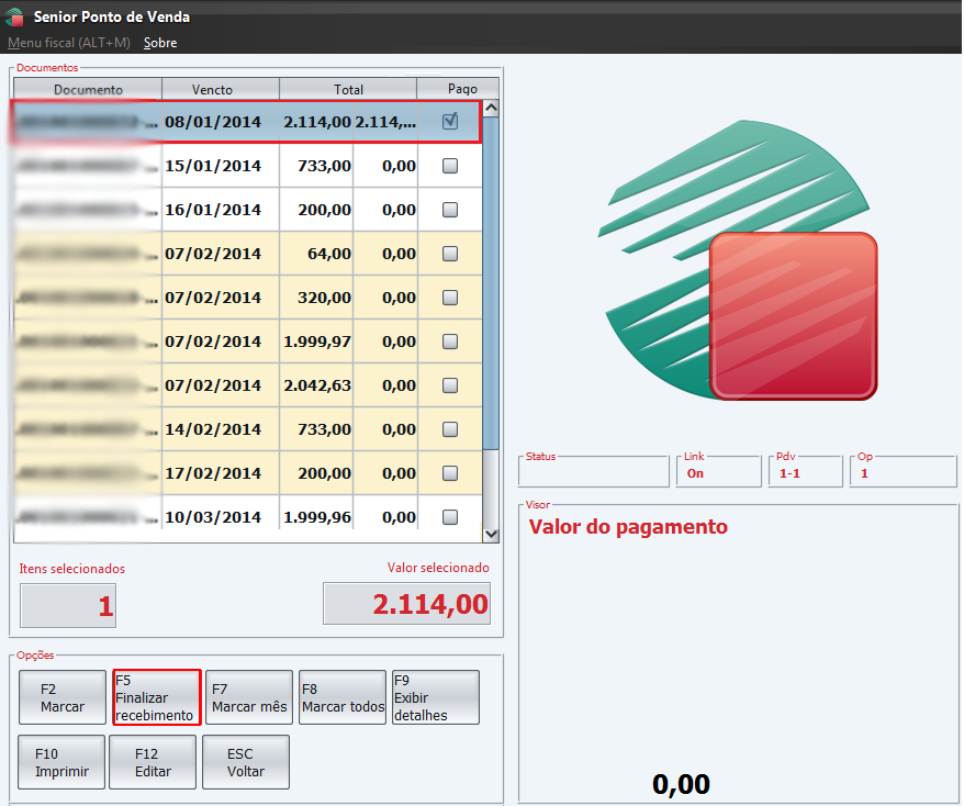 - Selecione a opção Recebimento na tela inicial do PDV;