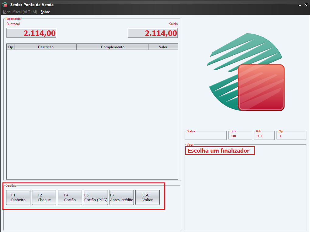 Caso o recebimento seja apenas de um cliente, utilize novamente o botão Subtotal e escolha um finalizador para finalizar o recebimento: