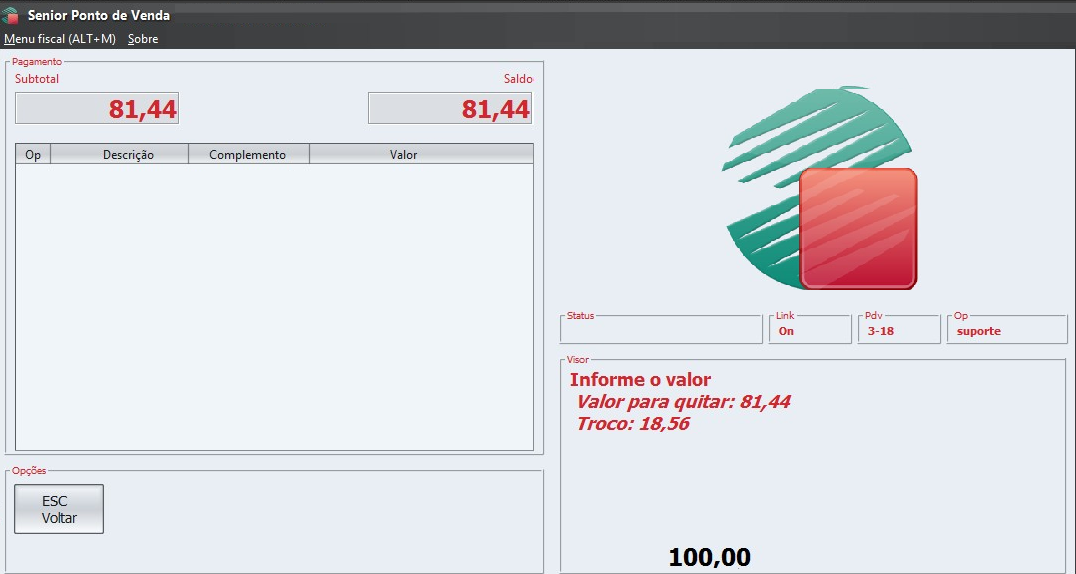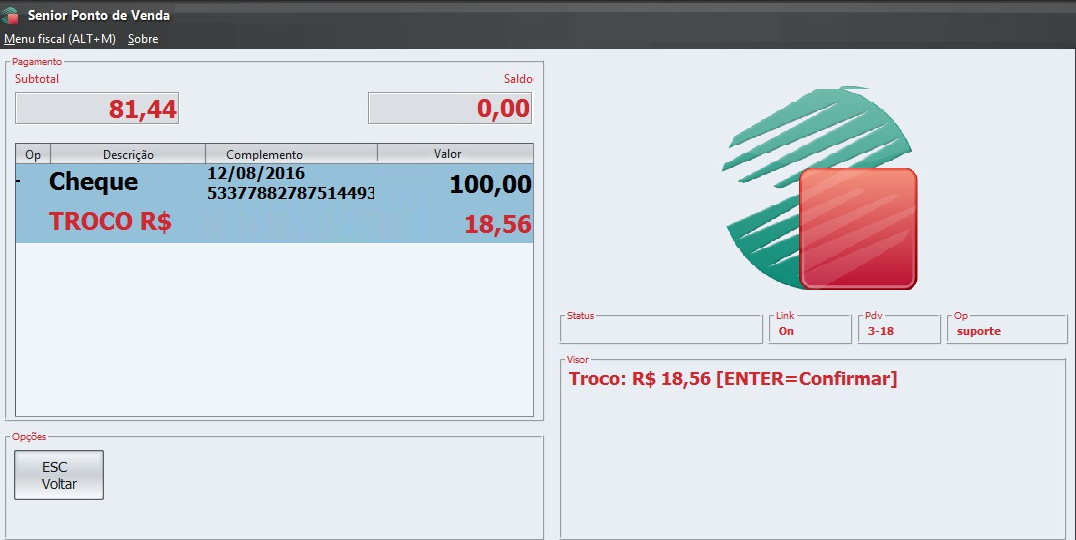 - Ao finalizar o recebimento, será gerado o troco, conforme exemplo abaixo: