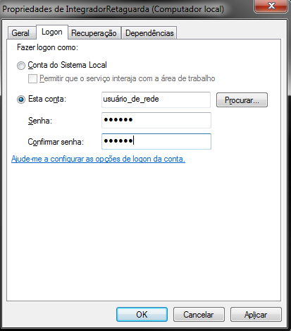 Para efetuar essa configuração abra os Serviços do Windows, pesquise pelo serviço do Integrador (normalmente com o nome IntegradorRetaguarda), clique com o botão direito do mouse > Propriedades. Na guia Logon, ativar a opção "Esta conta", informar usuário e senha válidos.