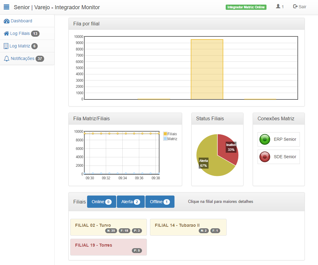 As informações exibidas contemplam: o Dashboard, que é mostrado na página inicial e também o Log Filiais, Log Matriz e Notificações, que exibem ao lado de sua descrição o número de pendências de integrações a serem tratados em cada um: