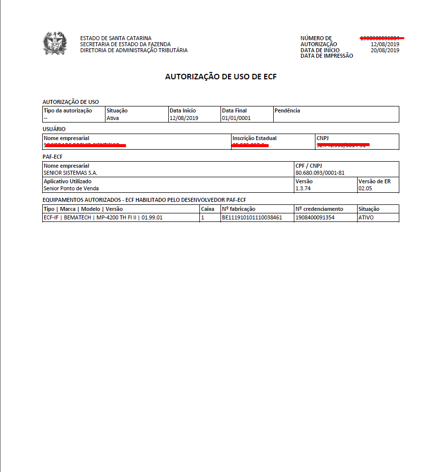 É necessário, ainda, emitir o arquivo de Autorização de uso da ECF, conforme imagem de exemplo abaixo: Após esses passos, a Senior irá liberar o uso das ECFs no site da SEFAZ, atualizando o cadastro realizado pelo órgão interventor. |