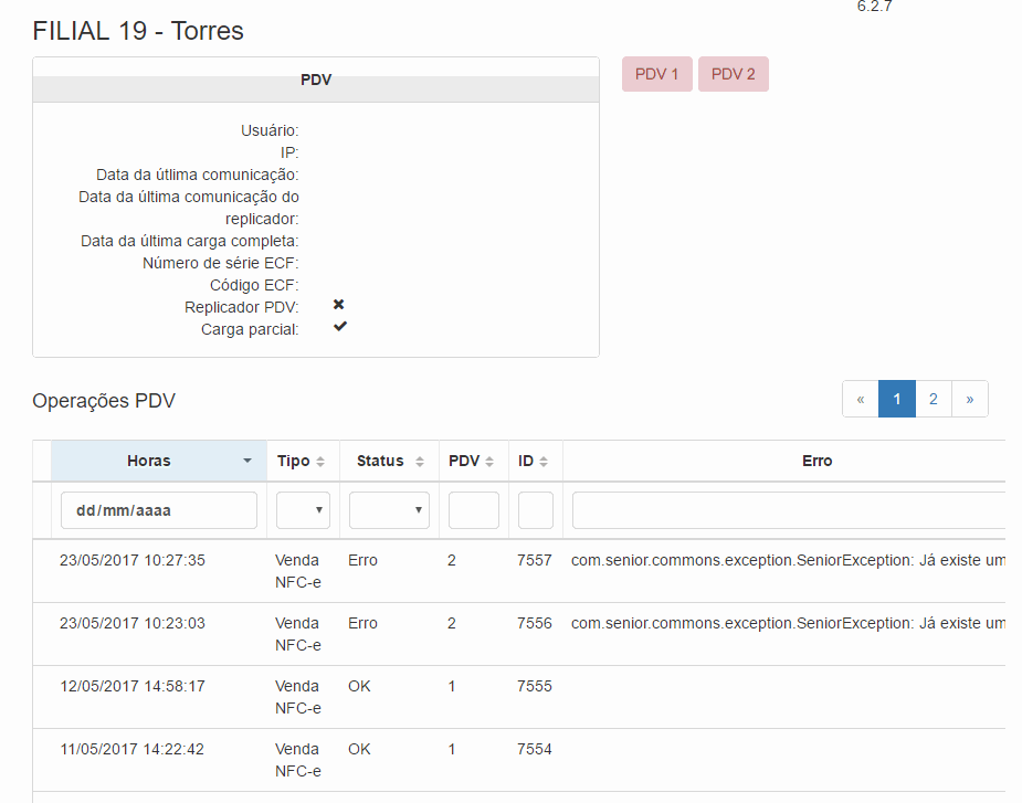 Ao clicar sobre qualquer filial, são exibidas as informações dos PDVs que fazem parte dela e, ao clicar sobre o PDV desejado, são mostradas suas informações específicas. Para ordenar as colunas em ordem crescente ou decrescente, clique sobre a desejada. Há ainda a possibilidade de filtrar algumas colunas e navegar entre várias páginas, caso haja: