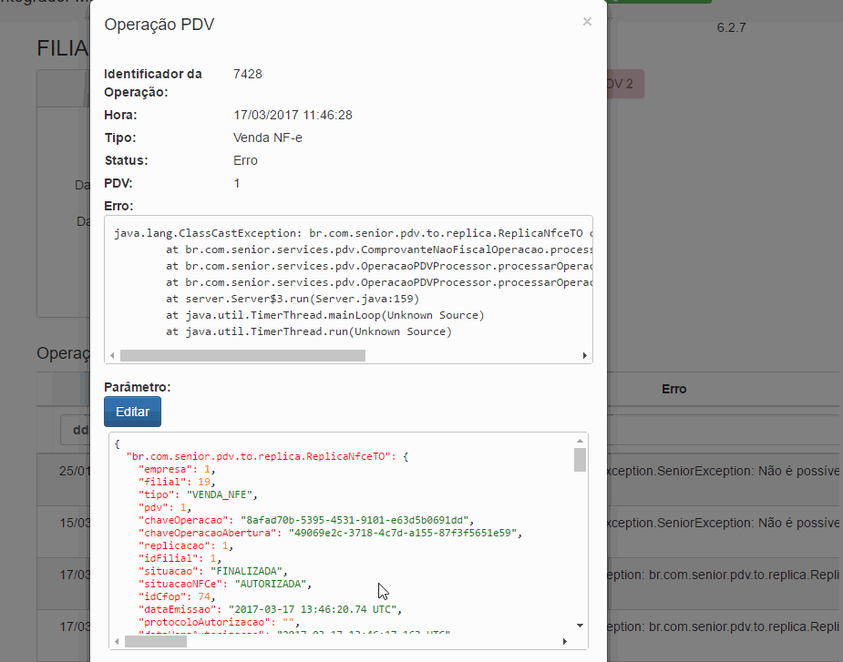 Ao clicar sobre cada linha, é mostrada uma janela denominada Operação PDV, que possibilita ver detalhes do erro, Excluir, Reenviar ou ainda Editar o json do parâmetro, caso, por algum erro, a integração do PDV para o Retaguarda tenha tenha sido enviada errado: