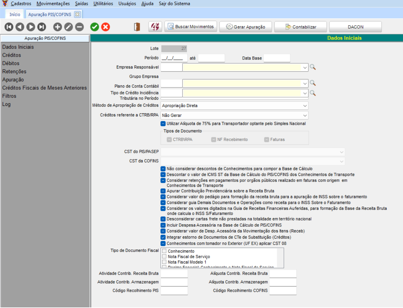O sistema move automaticamente para todos os documentos o CST PIS/COFINS:“50 -Operação com Direito a Crédito -Vinculada Exclusivamente a Receita Tributada no Mercado Interno” e a Natureza da Base de Cálculo “14 -Atividade de Transporte de Cargas -Subcontratação” - Depreciação/Amortização: notas de bens de patrimônio da empresa.