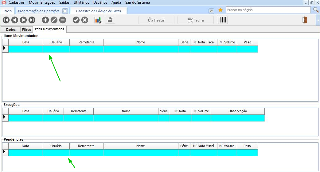 No COD, na aba “Itens Movimentados” os detalhes dos itens (1), a exceções que aconteceram na leitura feito pelo coletor (2) e as pendências (3).