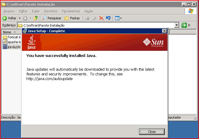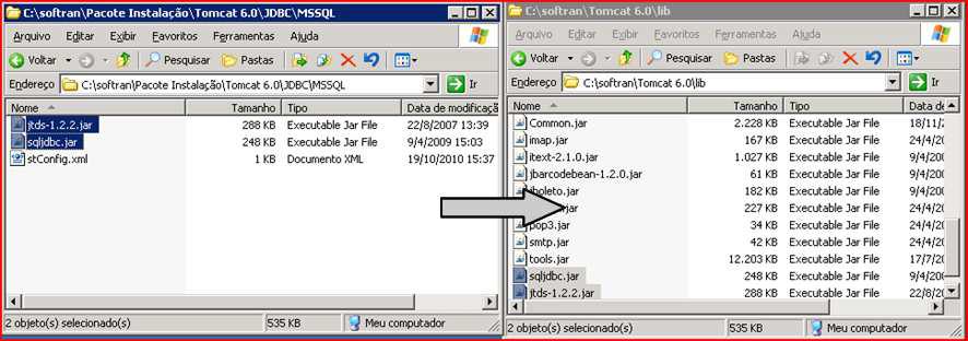 Na pasta de instalação “C:\softran\Pacote Instalação\” ir na pasta “Tomcat 6.0\lib”, copiar os arquivos para a pasta “C:\softran\Tomcat 6.0\lib”.