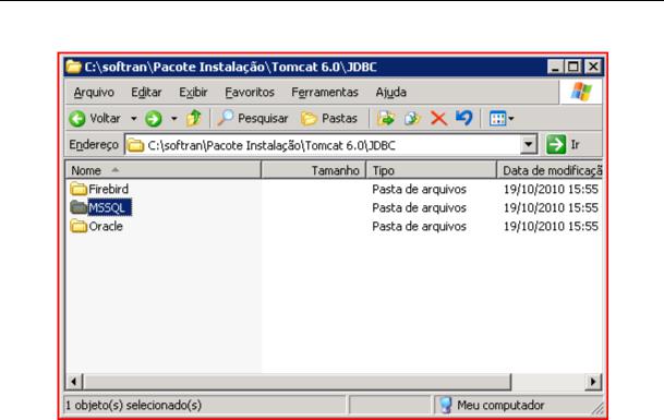 Novamente na pasta d e instalação “C:\softran\Pacote Instalação\” dentro da pasta “Tomcat 6.0\JDBC”, e scolha a pasta conforme o banco de dados q ue esta sendo utilizado no cliente. Fir ebird, Sql Server(MSSQL) ou Oracle.