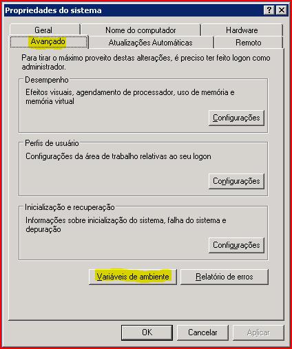 Na janela de propriedades do sistema, clicar na aba “Avançado” e em “Variáveis de Ambiente”.