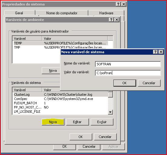 No quadro de “Variáveis do sistema” ir em Nova, informar o campo Nome da variável como “SOFTRAN” e o valor da variável com diretório que encontra se os arquivos de configuração, que como padrão é “C:\softran”. Clica r em “OK”
