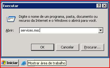 Nos serviços do Windows, ir em iniciar, executar, digitar “services.msc” e clicar em “OK”.